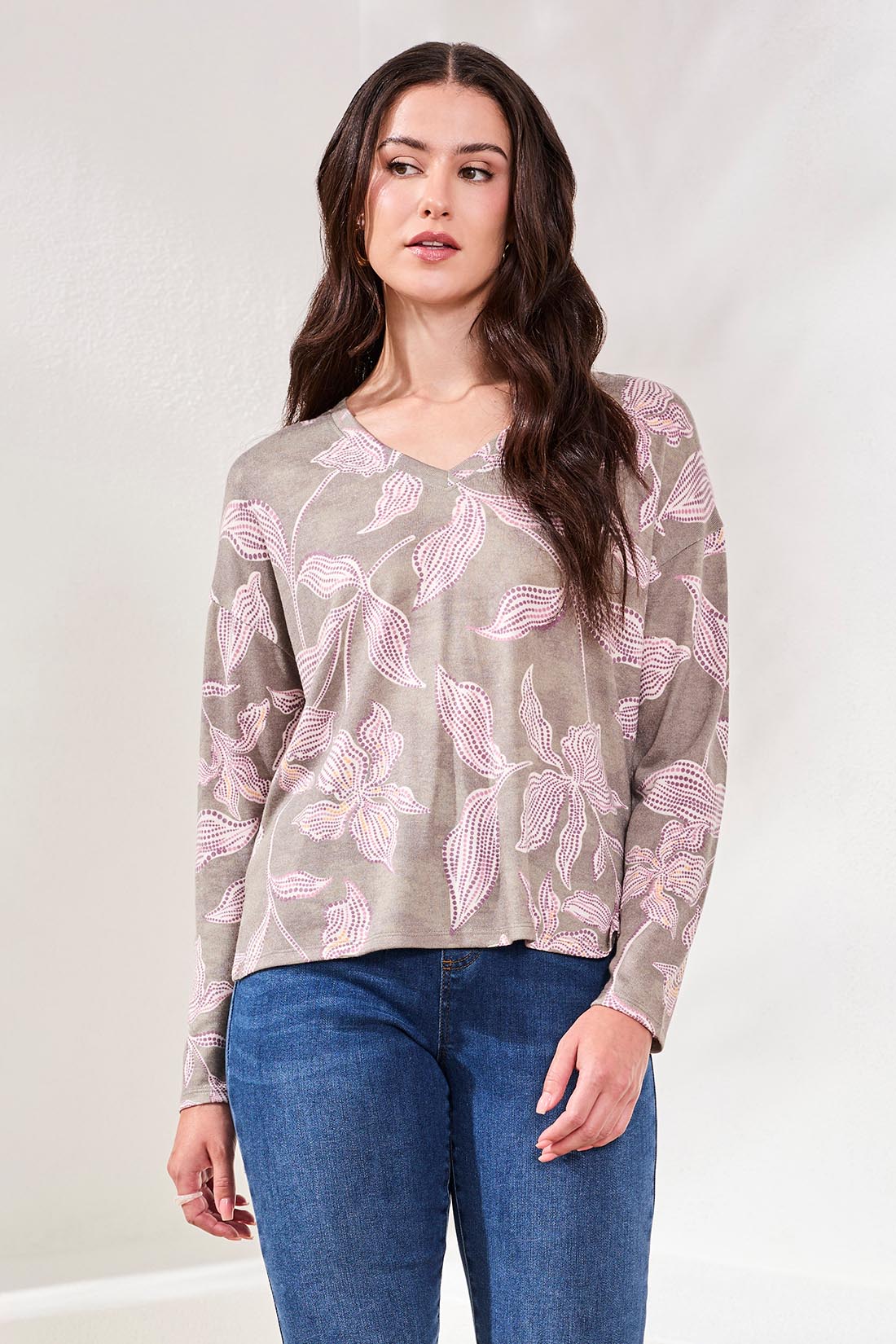 Stay cozy and stylish in this long-sleeve top. crafted from a fuzzy soft knit perfect for cooler days. The v-neckline frames your face with flattering structure. while the bold pattern. featured in a statement design. captures attention. Side slits at the hem offer a touch of ventilation and effortless movement. ensuring comfort throughout the day.