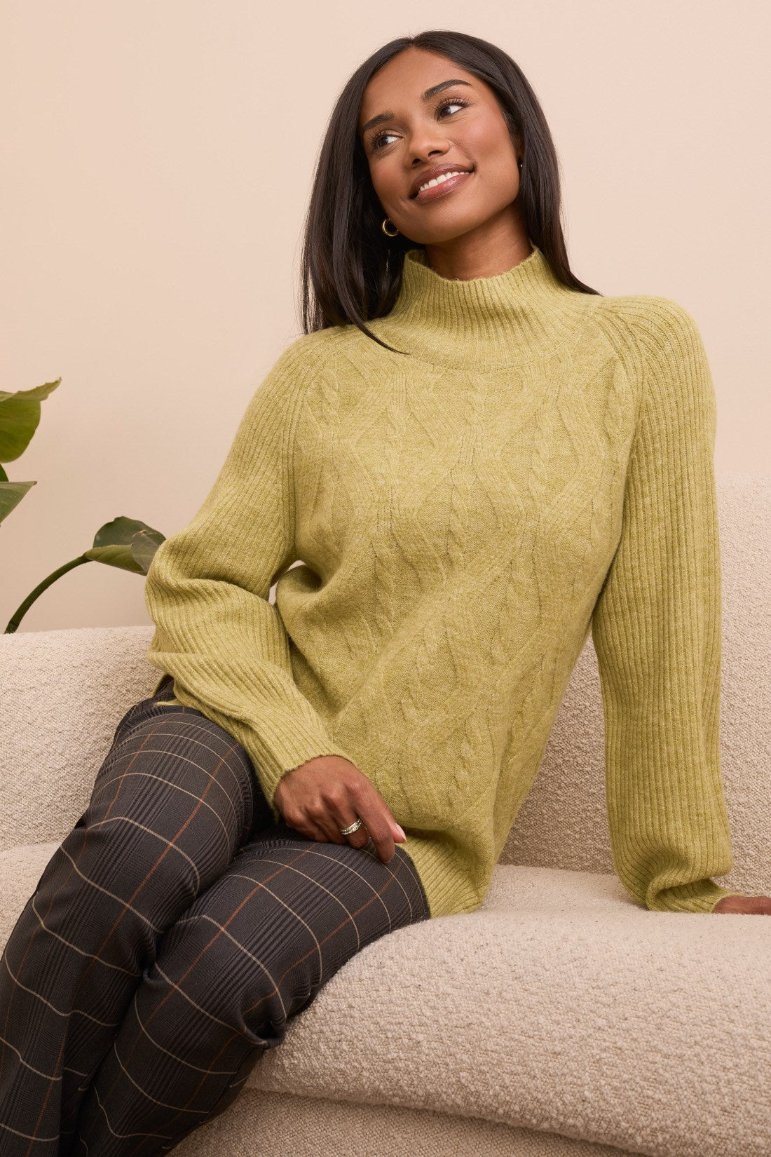 Cooler days call for this cozy sweater. crafted from a soft blend yarn with a rich texture for a luxurious feel. A sleek mock neckline and long puff sleeves add effortless elegance. while fitted cuffs create a refined finish.