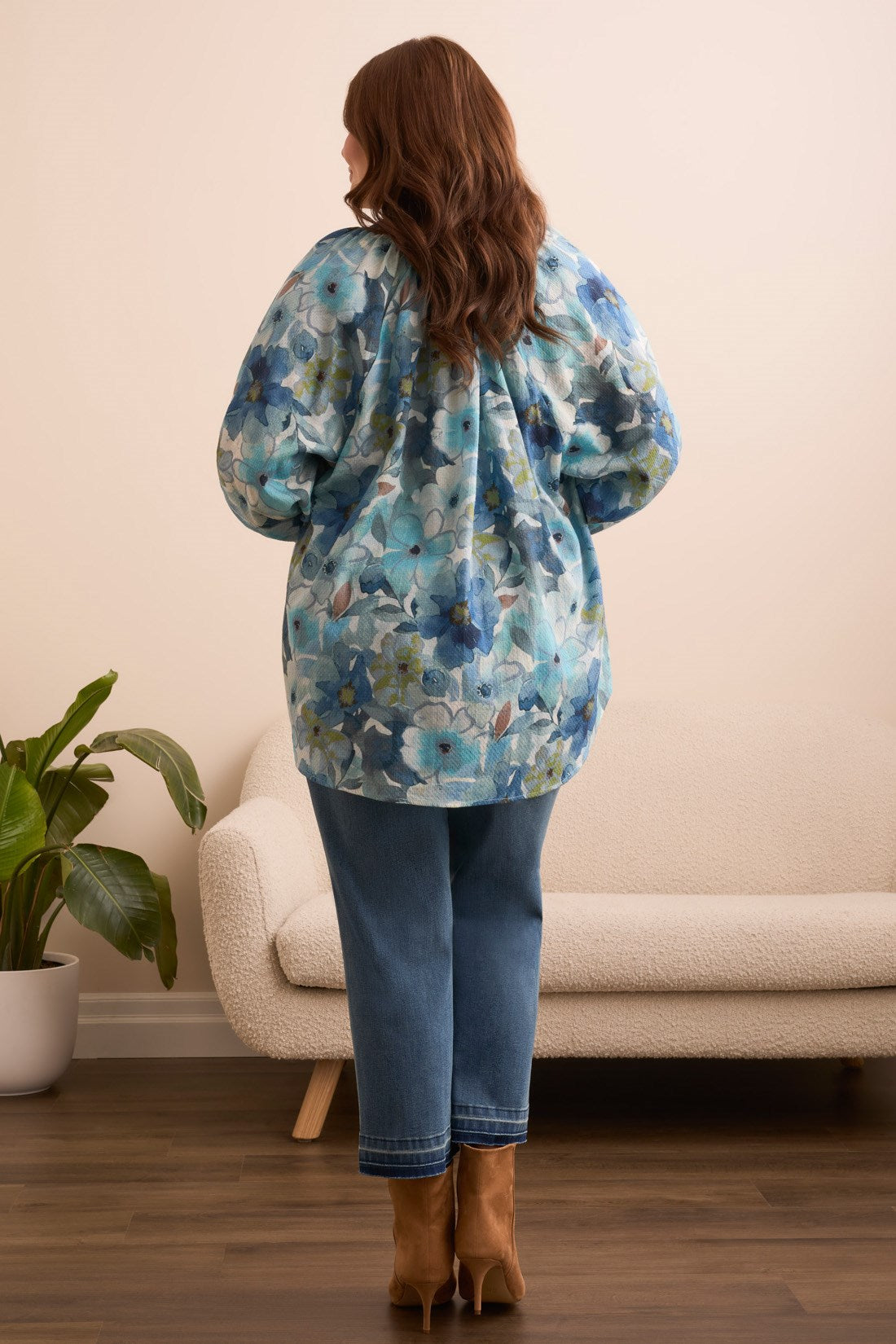 Infuse your look with a burst of vibrant charm in this relaxed blouse. featuring a lively floral pattern and airy mesh accents. The mocked detail along the neckline and sleeves creates a flattering silhouette. perfect for a laid-back pop-over style.