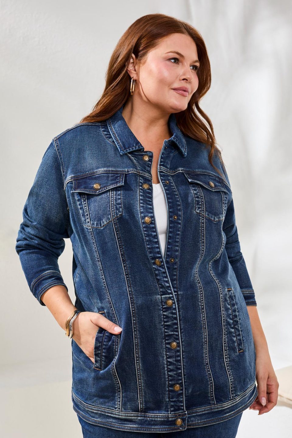 Add a touch of texture to your wardrobe with this soft boucle button-front jacket. featuring a classic button-front design and collared neckline. The boucle fabric creates a cozy. textured feel. while side pockets add functional appeal. The 24” length offers a flattering. versatile finish. making it perfect for effortless styling.