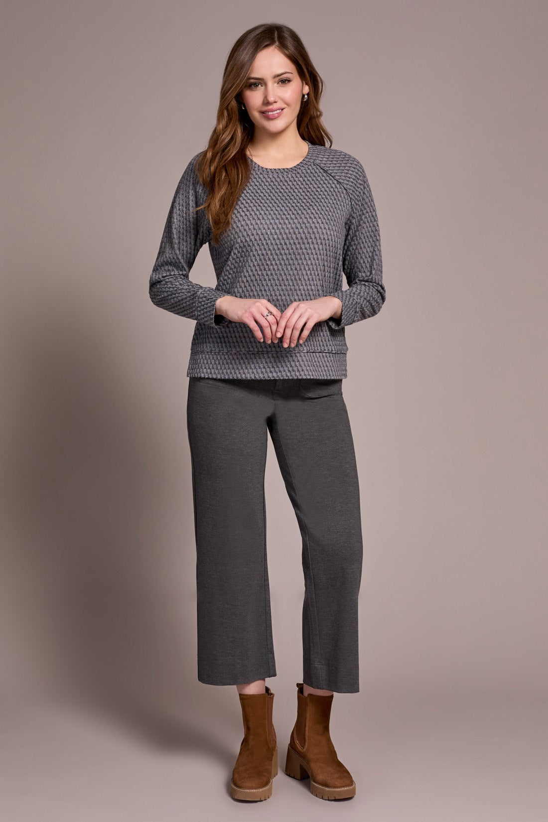 Opt for sophisticated ease with this top. featuring long raglan sleeves that provide luxurious comfort. The brushed textured knit enhances the design with subtle depth. making it an elevated choice for your casual wardrobe.